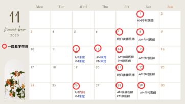 上記の通り、11月の診療時間変更および診療日のお知らせをいたします。